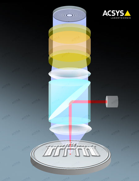 El archivo 3D resultante se puede usar para producción y reproducción y se puede procesar fácilmente en el software CAD. Las ventajas de este método sin contacto son la alta velocidad y las pequeñas distancias de la red de medición. Se puede lograr una precisión perfecta de 2 µm con el sistema de lentes reemplazables. La holografía conoscópica es un proceso patentado y ofrece la mayor precisión y precisión repetible en una amplia gama de aplicaciones. La imagen de la derecha muestra el diseño del escáner láser ACSYS. El rayo láser se utiliza para crear un punto de luz en el objeto que se va a medir. Parte de la luz, que se refleja en este punto de luz, es capturada por la lente del sensor y cae sobre el cristal conoscópico. Allí, los rayos de luz entrantes se separan inicialmente en rayos parciales, antes de reunirse con los rayos originales después de su salida del cristal. Esto crea un patrón de interferencia, que se captura con un sensor CCD y luego se evalúa electrónicamente.