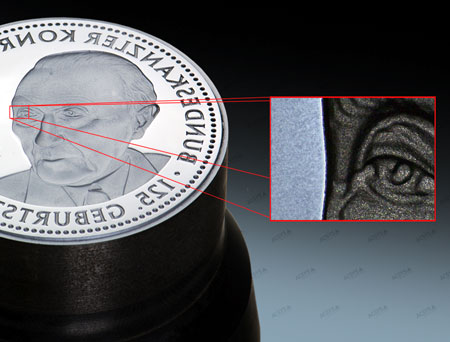 El reconocimiento óptico de piezas permite el procesamiento totalmente automatizado de piezas sueltas no paletizadas. En el ejemplo de la izquierda, la cámara de alta resolución reconoce automáticamente la disposición y el ángulo de rotación del sello de acuñación de monedas. Luego, el láser imprime un glaseado y un certificado de autenticidad en la misma ubicación.