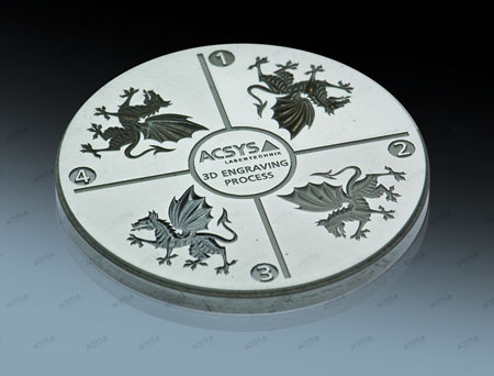 Grabado con láser 2.5D y 3D mediante eliminación de material controlada por software El grabado 2.5D y 3D difiere del grabado profundo en la extensión de la eliminación de profundidad controlada por software. De esta manera, los ángulos de borde predefinidos para joyería se pueden realizar tan fácilmente como las texturas / estructuras de superficie tridimensionales complejas en una amplia variedad de materiales muy diferentes.