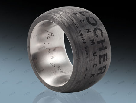 La tecnología láser de fibra flexible permite el procesamiento de diferentes materiales en un solo paso de trabajo. La imagen de la derecha muestra un anillo bimaterial hecho de carbono y titanio. El anillo fue grabado sin problemas en su circunferencia directamente en el carbón usando el láser. El grabado interior en titanio, así como el grabado exterior, se realizaron utilizando un cabezal divisor.