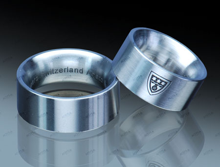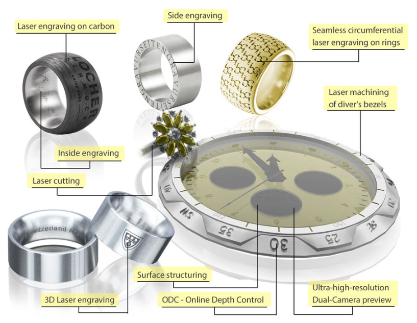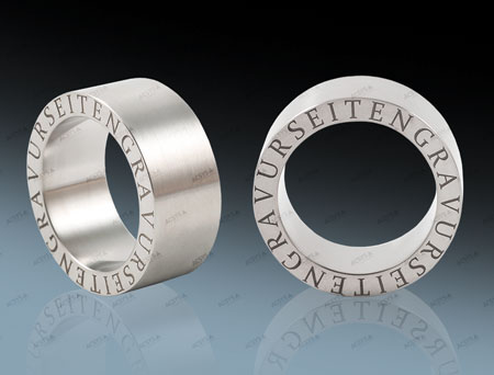 El grabado y marcado con láser circunferencial sin cortes en la circunferencia de los anillos es una de las tareas más desafiantes en el campo del mecanizado por láser. Los sistemas de mecanizado ACSYS de precisión, con sus cabezales divisorios controlados por NC y la vista previa del resultado del sistema LAS de ajuste en vivo aseguran la máxima precisión y repetibilidad para altas velocidades de desplazamiento. Grabado láser circunferencial sin costuras en joyería.