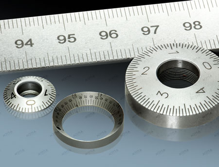 La imagen muestra el marcado circular preciso de una escala en miniatura hecha de acero inoxidable. Para lograr el máximo contraste, se usó el marcado de recocido como el proceso de marcado.